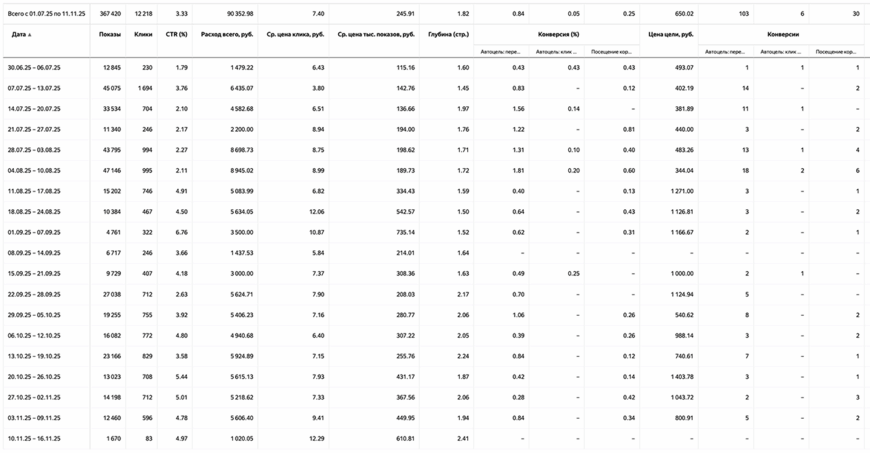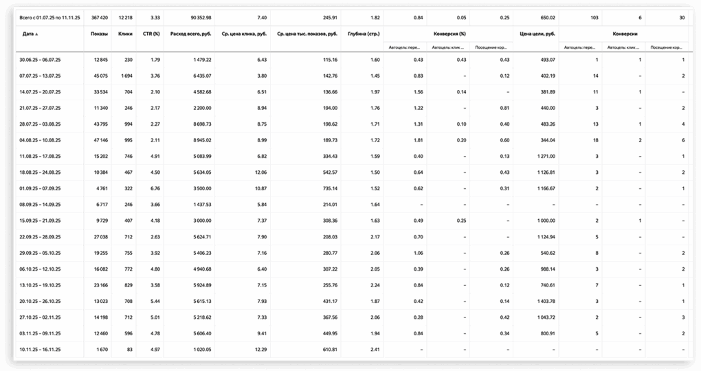 • Клиент получил оптимальный трафик под бюджет и продолжает сам пополнять кампании без пересборки структуры.